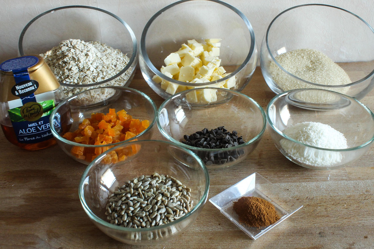 Une fois le mélange fondu, transvasez-le dans un grand saladier. Ajoutez alors les flocons d’avoine, les graines de tournesol, la noix de coco râpée, la cannelle et les abricots secs hachés. Mélangez et ajoutez ensuite les pépites de chocolat.